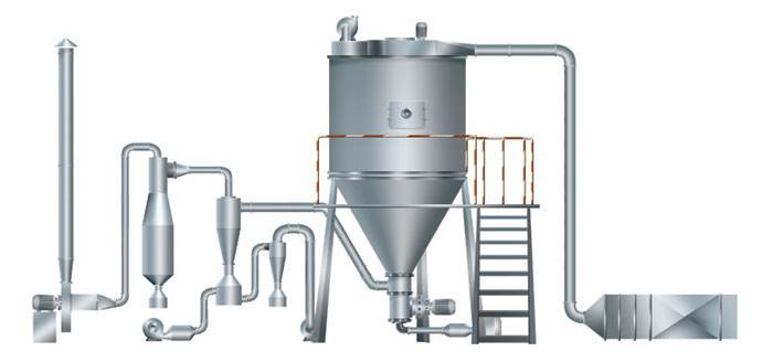 空气经过滤和加热,进入干燥器顶部空气分配器,热空气呈螺旋状均匀地进入干燥室。料液经塔体顶部的高速离心雾化器,(旋转)喷雾成极细微的雾状液珠,与热空气并流接触在极短的时间内可干燥为成品。成品连续地由干燥塔底部和旋风分离器中输出,废气由风机排空。